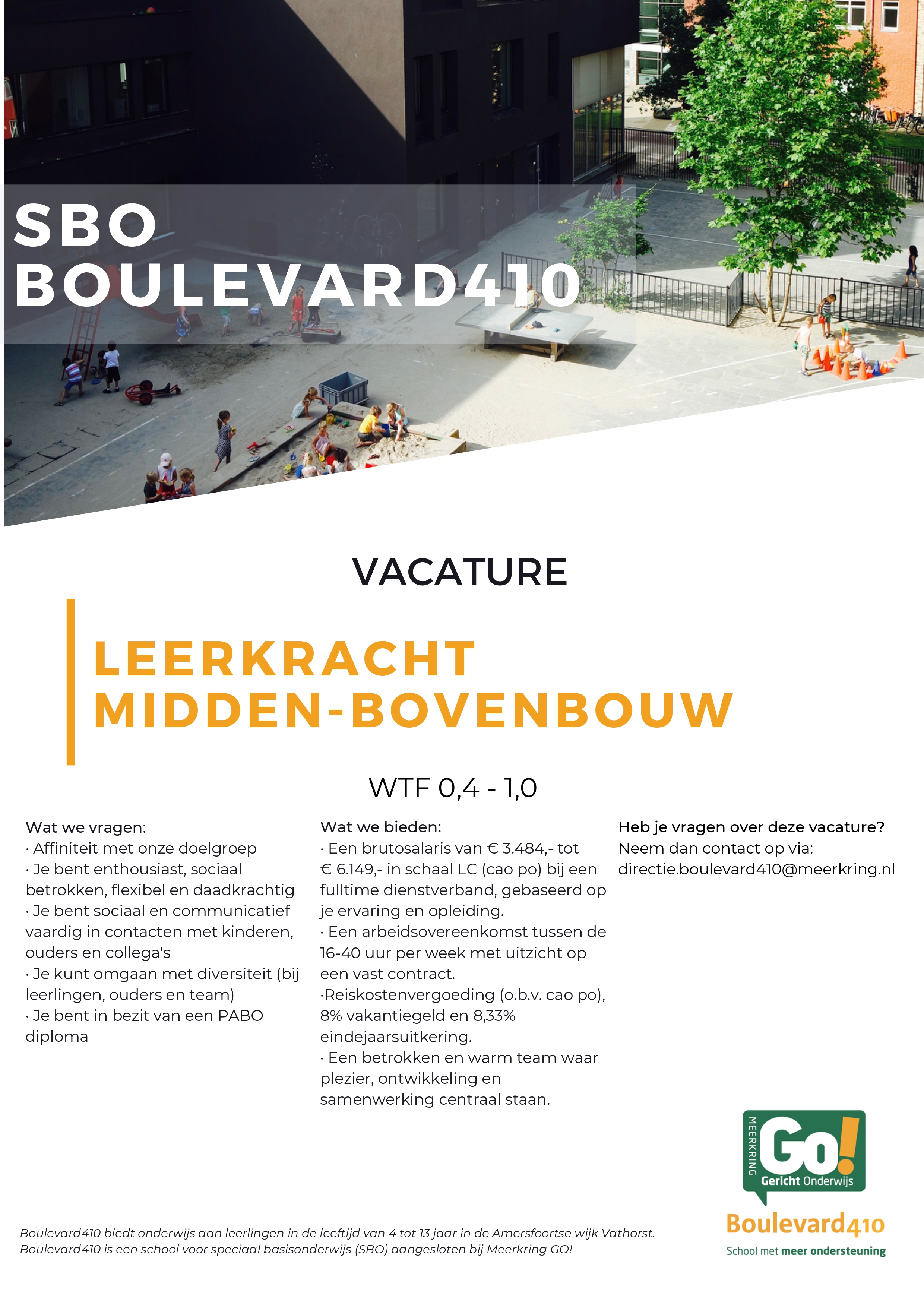 Boulevard410 is aangesloten bij Stichting Meerkring Primair Onderwijs Amersfoort. Wil je werken in het basisonderwijs in Amersfoort, heb je een vraag of ben je benieuwd wat Meerkring precies doet?